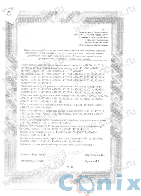 Компания Conix обладает обширным штатом специалистов, способных выполнить широкий спектр строительно-монтажных работ. В 2010 году мы стали участником саморегулируемой организации НП "Управление строительными предприятиями Петербурга" и получили свидетельство подтверждающее квалификацию наших сотрудников и право проводить работы по следующим направлениям (подробный список с расшифровкой видов работ находится в конце страницы).