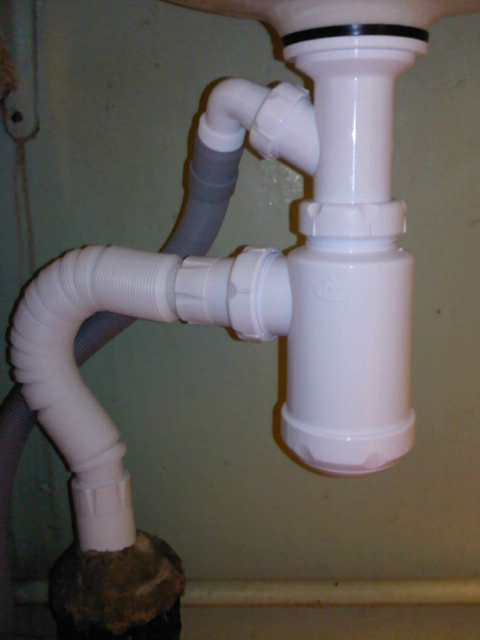 Организация слива в канализацию: для этого демонтируем старый сифон из под раковины, затем устанавливаем на его место новый сифон Jimten, у которого есть специальный отвод для подключения сливного шланга. Далее подсоединяем к сифону гофру и сливной шланг от стиральной машины, в живую, это выглядит примерно вот так.